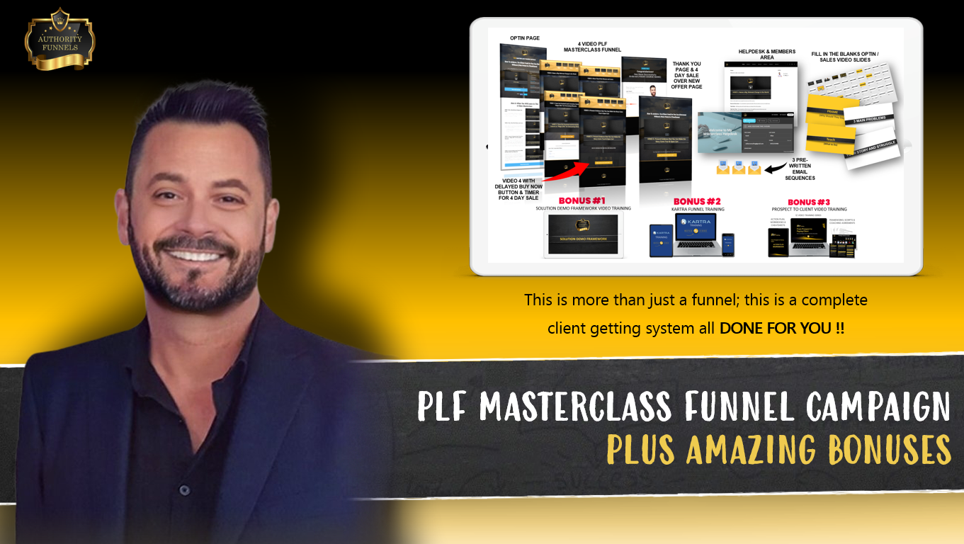 Similar to the famed PLF style product launch funnel, this masterclass funnel begins with a high converting opt-in page before moving onto to a 4 step video product /service masterclass where you nurture leads into sales